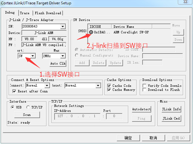 在选择了SW接口之后,将飞控开关打到on,点击Auto Alk,如果连接正确,就会扫描到开发板上的SW接口。