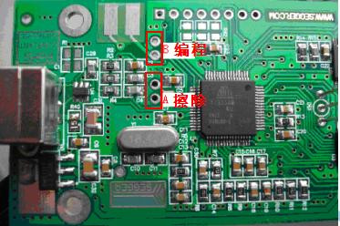 擦除芯片过程,将J-Link连接到电脑,短接A两孔约5秒钟,断开,然后拔掉J-Link与电脑的连接。如果重新连接电脑,led灭掉,在设备管理中找不到任何相关设备,则表示擦除成功。