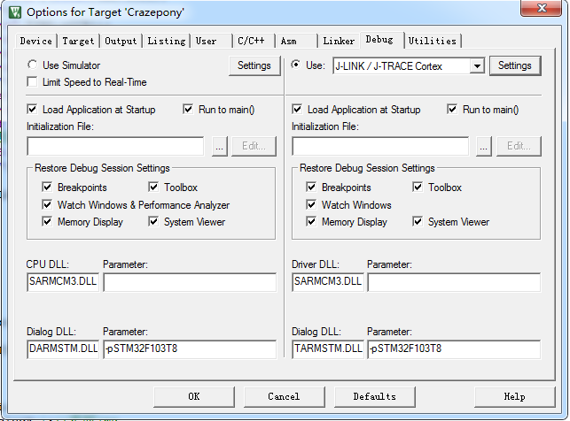 使用keil打开crazepony工程文件,点击Options for Target 'Crazepony',选择Debug部分,下拉选择J-Link/J-Trace Cortex.