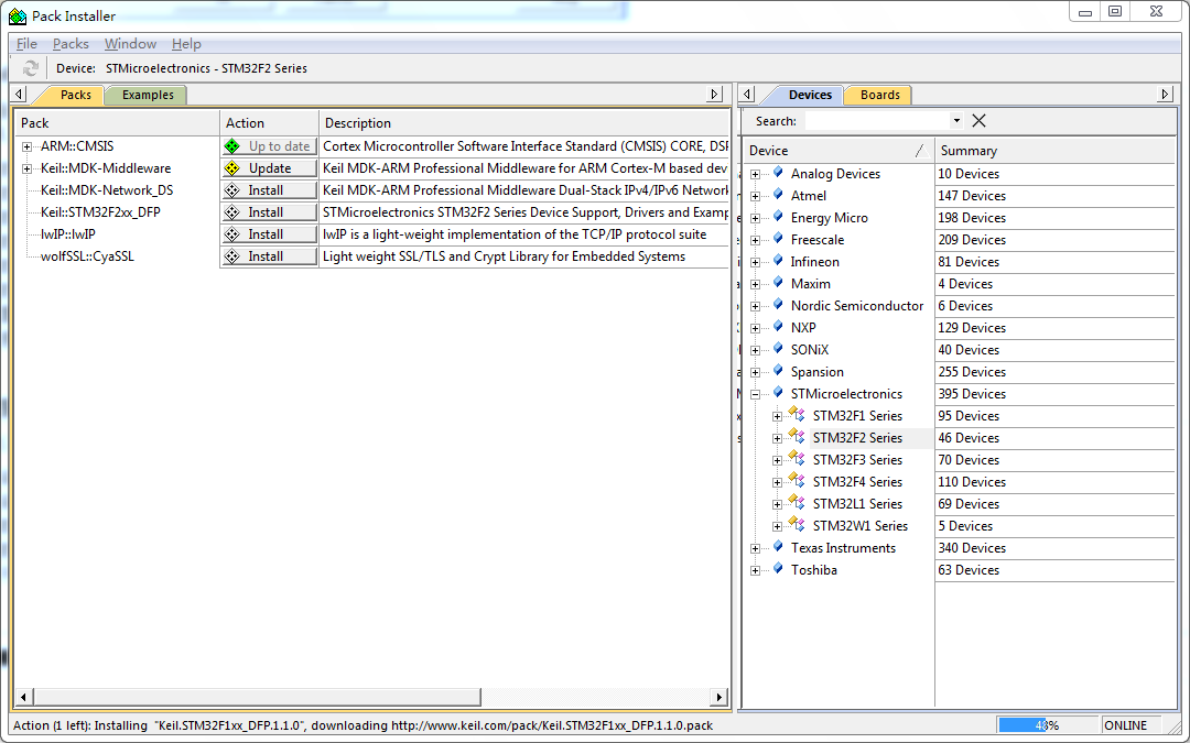 Keil 5的安装文件是Keil 4的几倍,很多组件与模板都需要分开来安装,安装稍微比较麻烦。在安装完主程序之后,会弹出Pack Installer的对话框,用于被开发芯片对应模板的安装。crazepony使用的STM32F103T8主控芯片,所以从右边选择STM32F1 Series,在左侧点击安装。