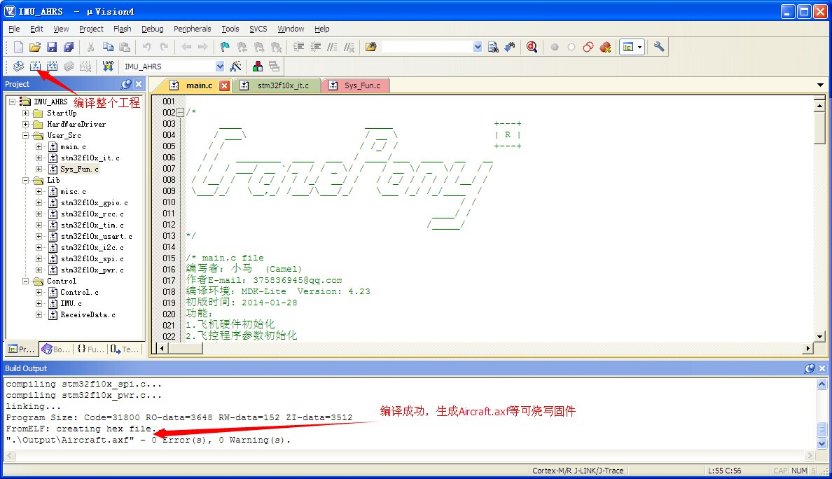 点击左上角的编译按钮,编译整个项目,在工程下生成Output目录,目录中Crazepony.hex就是可以烧写到STM32的固件。