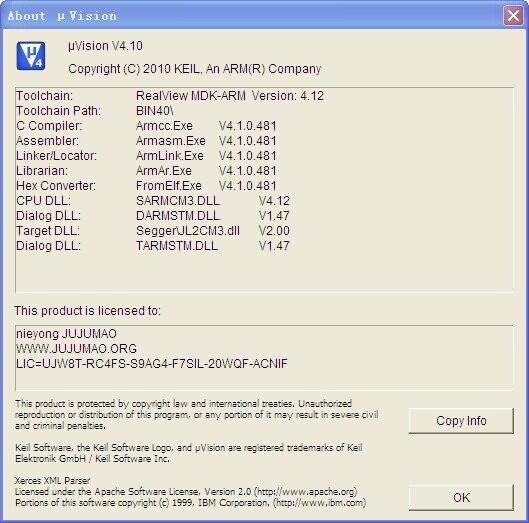 由于主控使用的是ARM Cortex-M3内核的STM32,所以必须使用带有ARM编译工具链的Keil 4。网络上很多只有几十兆大小的的Keil 4可能只支持C51开发。Crazepony百度云网盘提供带有ARM编译工具链的Keil 4安装文件下载,带有破解注册机和破解说明文档。用户自行下载安装,可以看到该Keil版本为v4.10。