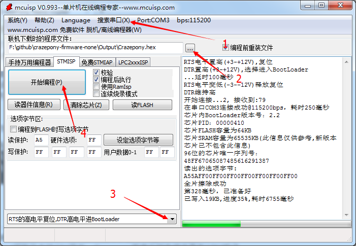 STM32固件的调试和烧入可以使用J-Link或者ST-Link等调试器进行开发,详见J-Link的使用及常见问题。Crazepony也支持USB口烧入,即采用ISP下载,操作简单。只需要安装cp2102驱动程序,使用一根Mini USB数据线连接电脑。详见固件烧写,烧录界面如图所示: