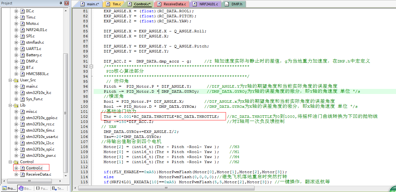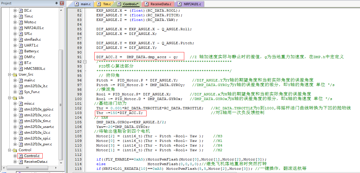 Thr是一个油门的全局变量,在Thr被遥控数据赋值以后,再对Thr进行一次减操作,减去一个误差量DIF_ACC.Z,DIF_ACC.Z是Z轴的当前加速度减去静止时的加速的差值。当飞机上升时,DIF_ACC.Z是一个正数,Thr减去一个正数,Thr就会比遥控实际赋值要小,体现出来的效果就是上升不会那么冲;同理,下降时DIF_ACC.Z为一个负数,Thr减去一个负数,相当于加上一个正数,Thr就比遥控实际赋值要大,体现出的效果就是下降不会很急。
