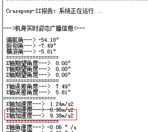 将Crazepony水平静止放置,然后看看这里打印的Z轴加速度值是多少,将源代码的静止重力加速度值g,修改成串口助手里看到的那个值就好了,这是属于一个初始人工校准过程,我们后续会考虑实现一个学习算法来替代这个过程,它将不会再需要用户介入,你只需要开一个电源开关,学习算法会自我学习,将学习得到的最优参数存放在内部的EEPROM中。