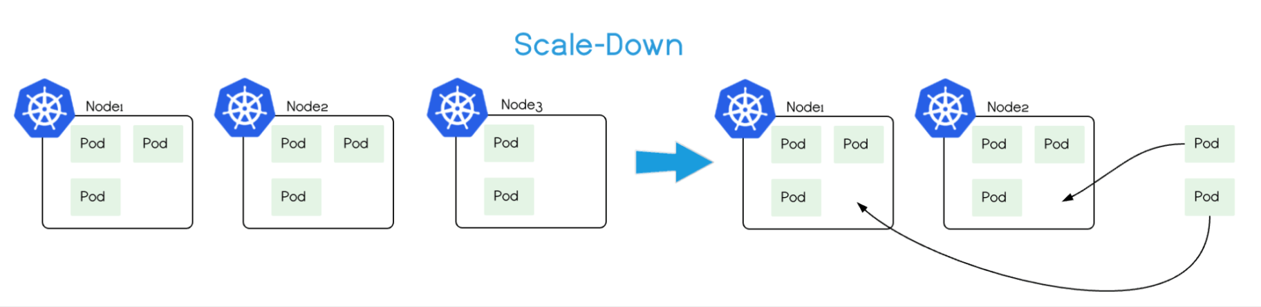 Cluster AutoScaler 也会定期(默认间隔10s)自动监测 Node 的资源使用情况,当一个 Node 长时间(超过10分钟其期间没有执行任何扩展操作)资源利用率都很低时(低于50%)自动将其所在虚拟机从云服务商中删除(注意删除时会有1分钟的 graceful termination 时间)。此时,原来的 Pod 会自动调度到其他 Node 上面(通过 Deployment、StatefulSet 等控制器)。