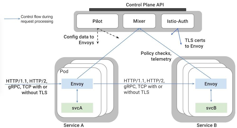 - Mixer:负责访问控制、执行策略并从Envoy代理中收集遥测数据。Mixer支持灵活的插件模型,方便扩展(支持GCP、AWS、Prometheus、Heapster等多种后端)