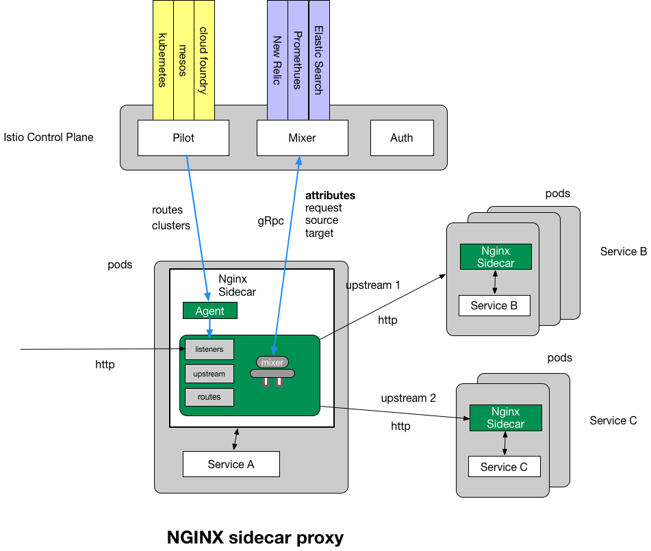 在数据平面上,除了Envoy,还可以选择使用 nginxmesh 和 linkerd 作为网络代理。比如,使用nginxmesh时,Istio的控制平面(Pilot、Mixer、Auth)保持不变,但用Nginx Sidecar取代Envoy: