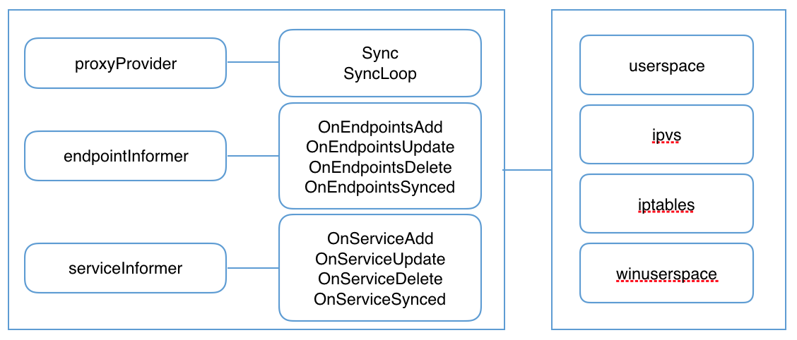 kube-proxy监听API server中service和endpoint的变化情况,并通过userspace、iptables、ipvs或winuserspace等proxier来为服务配置负载均衡(仅支持TCP和UDP)。