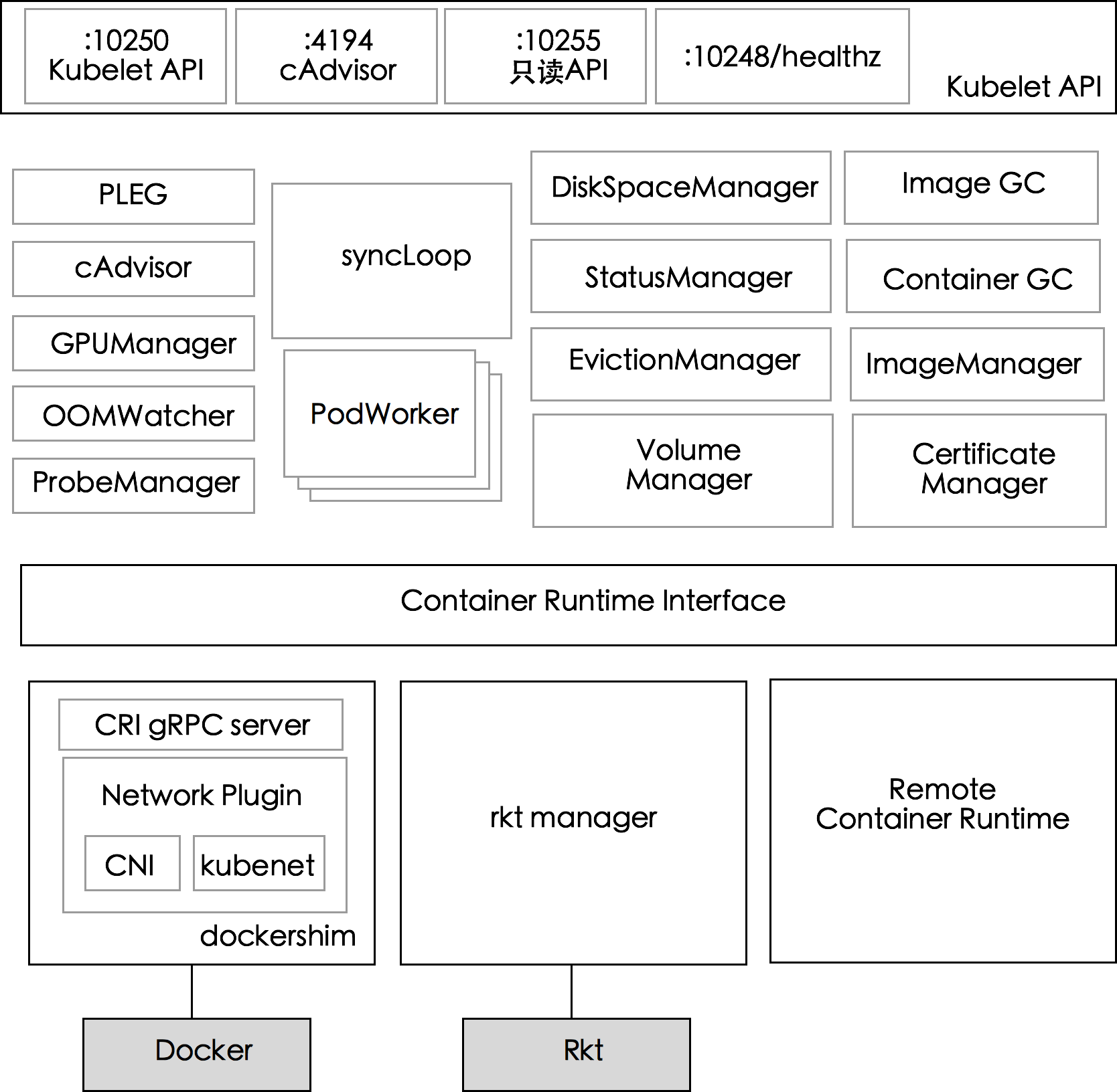 如下kubelet内部组件结构图所示,Kubelet由许多内部组件构成