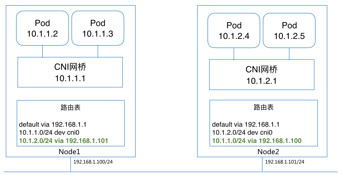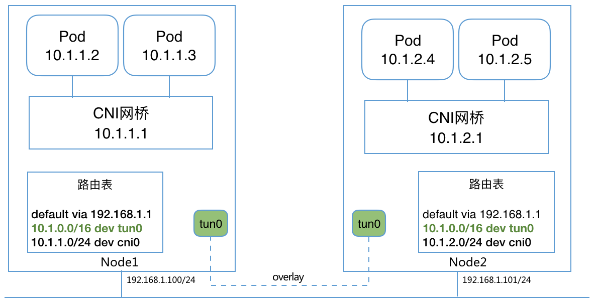 注意:Bridge模式下,多主机网络通信需要额外配置主机路由,或使用overlay网络。可以借助Flannel或者Quagga动态路由等来自动配置。比如overlay情况下的网络结构为