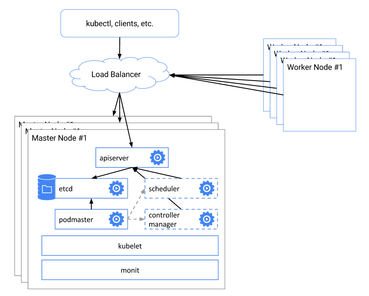 Kubernetes从1.5开始,通过kops或者kube-up.sh部署的集群会自动部署一个高可用的系统,包括